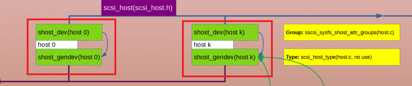 这些host分别连接着片外的scsi设备device(0)...device(k)外设。为了形象点,host(1)没有接任何scsi外设。