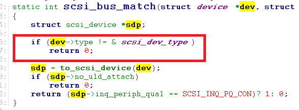 sdev_gendev挂在”scsi” bus上,它会触发bus驱动,驱动会通过sdev_gendev->type字段,来判断该device是否和自己匹配。