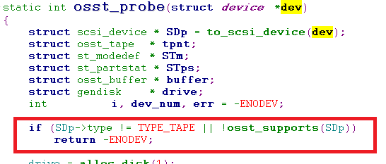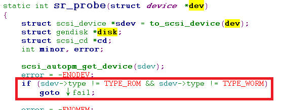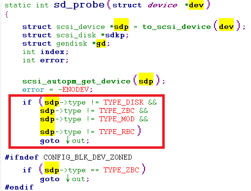 基本上这些驱动都会在自己的probe里面去查看sdev_gendev->type字段,判断该device是否和自己匹配。例如: