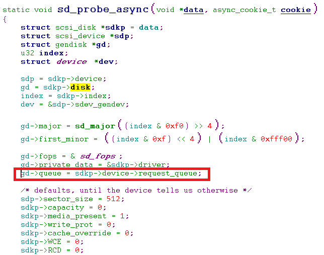 “sd”会针对每个匹配上的sdev_gendev,做alloc_disk和device_add_disk操作。也就是说在user空间创建对应的块设备节点,例如sda,sdb这些节点。 “sd”也会在”scsi_disk”class上创建和sdev_gendev同名的device,会有对应group attr和其对应做一些操作。 关于sd设备驱动特别说明 Sd设备驱动本身是块设备驱动,它需要使用block相关的request_queue来发送块设备相关请求给lun,前面讲到lun和host之间的沟通是通过block层来完成的,每个lun有自己独有的request_queue,因此sd驱动直接把这个request_queue拿来用之,把这个request_queue和本地申请的alloc_disk进行绑定。sda,sdb这些块设备就可以直接通过request_queue给lun发送请求。