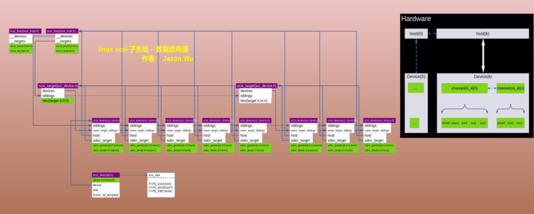 硬件拓扑结构是一个树形。在linuxscsi子系统里面,host,target,lun对应的scsi_host, scsi_target, scsi_device也是一个树形链表结构,如下图:
