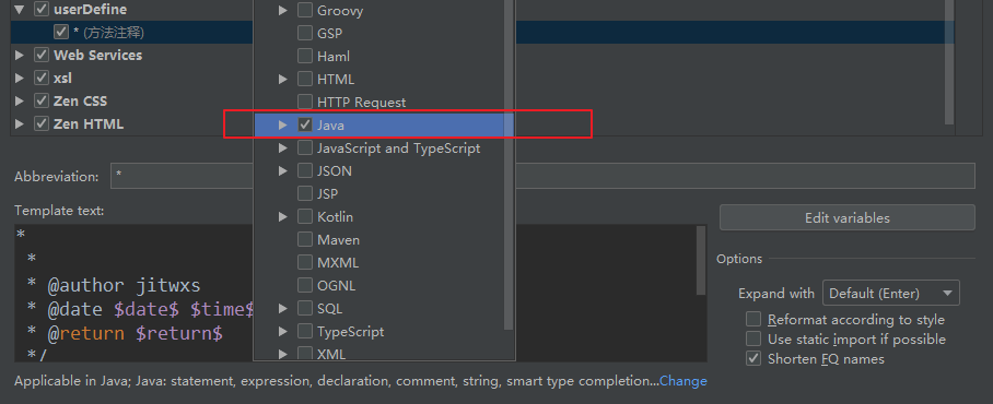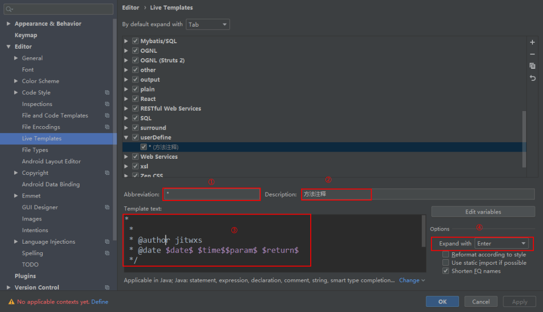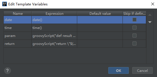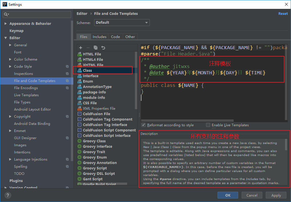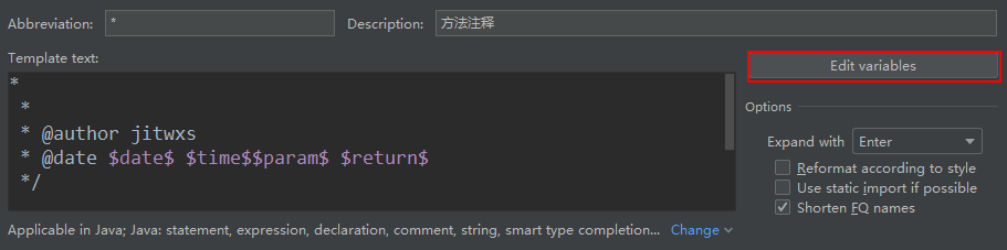在我提供的示例模板中,说明了作者和时间,IDEA 支持的所有的模板参数在下方的 Description