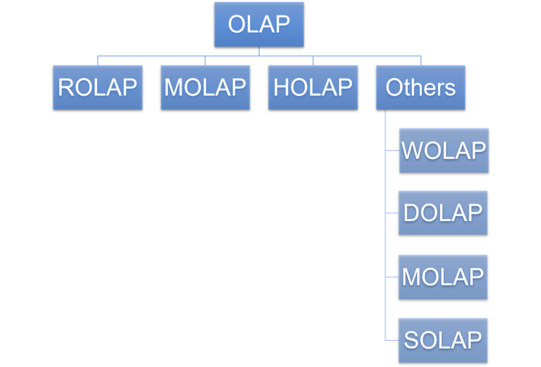 除此之外,还包含一些其他分类,包括启用Web的OLAP(WOLAP),桌面OLAP(DOLAP),移动OLAP(MOLAP)和空间OLAP(SOLAP)。但总体上不太流行,故此不再进行介绍。