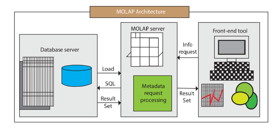 MOLAP架构包含了数据库服务器、MOLAP服务器和前端工具三个组件。