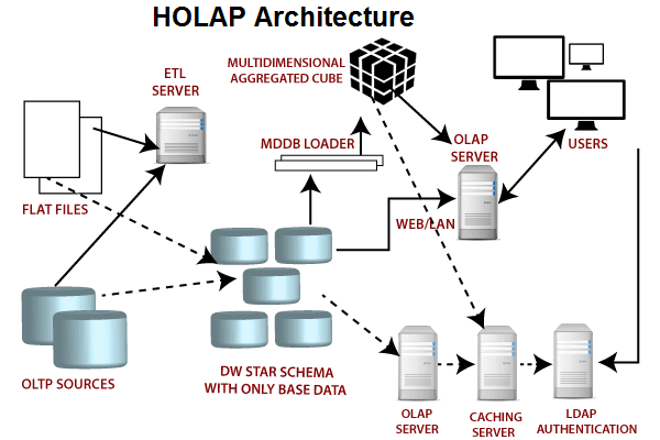 混合 OLAP,是 MOLAP 和 ROLAP 的一种融合。当查询聚合性数据的时候,使用MOLAP 技术;当查询明细数据时,使用 ROLAP 技术。在给定使用场景的前提下,以达到查询性能的最优化。混合OLAP的技术体系架构如下图: