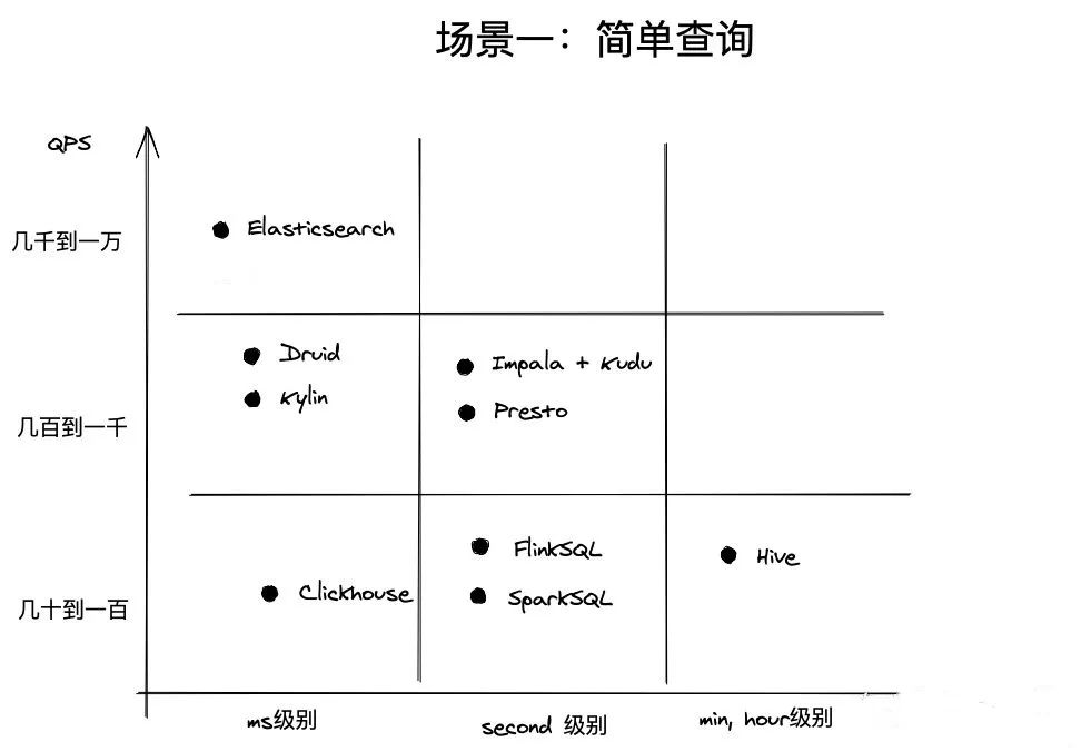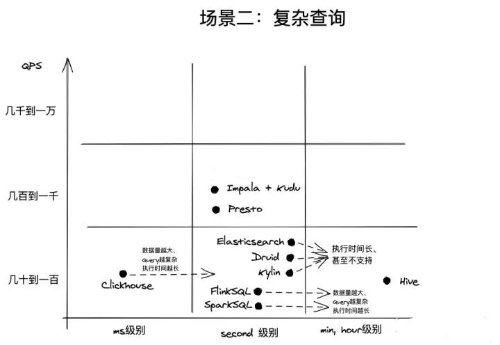 复杂查询指的是复杂聚合查询、大批量数据SCAN、复杂的查询(如JOIN)。在ad-hoc场景中,经常会有这样的查询,往往用户不能预先知道要查询什么,更多的是探索式的。这里也根据QPS和查询耗时分几种情况,如下图所示,根据业务的需求来选择对应的引擎即可。有一点要提的是FlinkSQL和SparkSQL虽然也能完成类似需求,但是它们目前还不是开箱即用,需要做周边生态建设,这两种技术目前更多的应用场景还是在通过操作灵活的编程API来完成流式或离线的计算上。