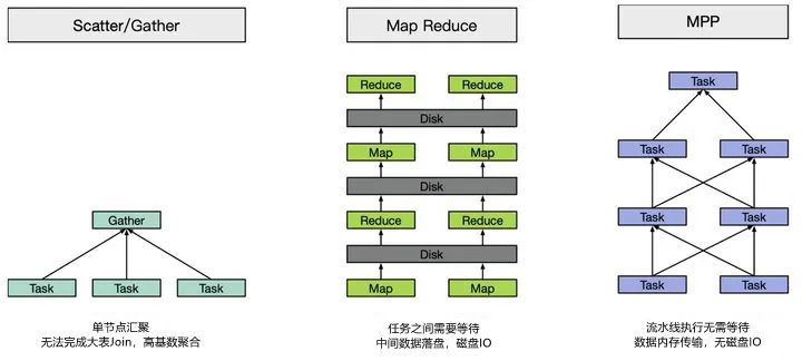 MPP:MPP学名是大规模并行计算,其实很难给它一个准确的定义。如果说的宽泛一点,Presto、Impala、Clickhouse、Spark SQL、Flink SQL这些都算。有人说Spark SQL和Flink SQL属于DAG模型,我们思考后认为,DAG并不算一种单独的模型,它只是生成执行计划的一种方式。
