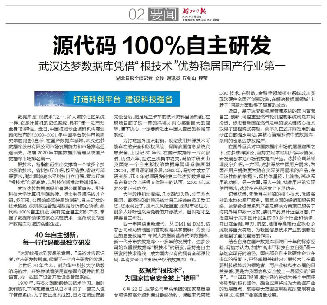 围绕高水平科技自立自强,着力打造“根技术”创新高地。“十四五”期间,数字经济将成为整个中国经济转型的核心部件,以数据库为代表的关键领域的技术创新,将发挥重要作用。近日,《湖北日报》刊登了《源代码100%自主研发 武汉达梦数据库凭借“根技术”优势稳居国产行业第一》一文。该文围绕武汉达梦数据库股份有限公司(以下简称“达梦公司”)凭借企业综合实力和领先的技术优势获得国产数据库市场占有率第一展开介绍,并对达梦40年坚持自主创新,加快关键领域科技自立,守护我国信息安全,不断实现企业高质量发展进行了综合报道。
