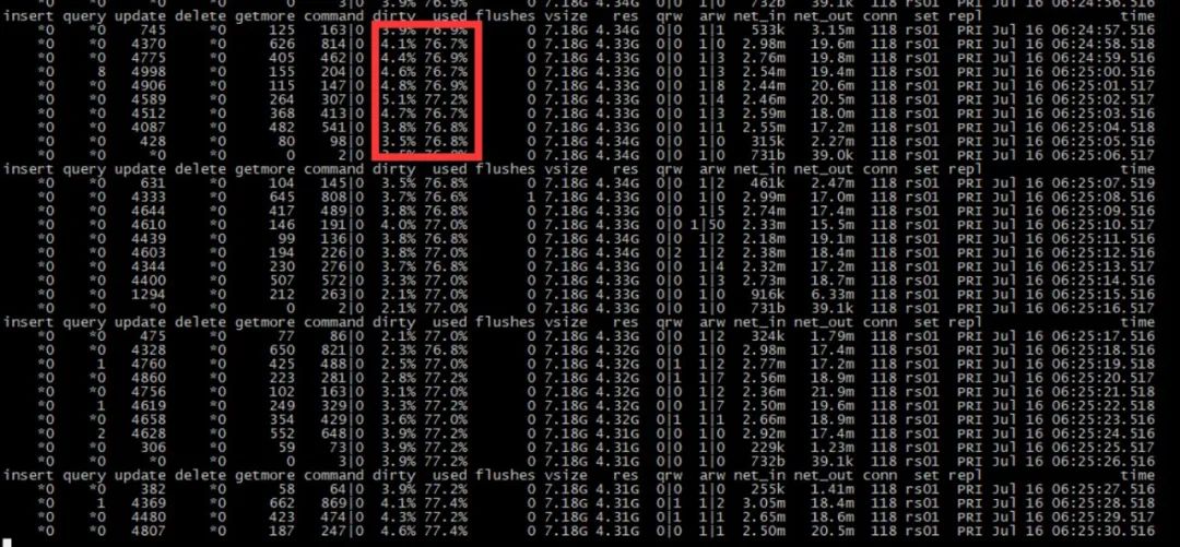 insert query update delete getmore command dirty used flushes vsize res qrw arw net_in net_out conn set repl time*0 *0 4398 *0 611 796|0 5.0% 72.7% 0 7.20G 3.98G 0|0 2|0 2.98m 15.5m 118 rs01 PRI Jul 16 02:54:17.526*0 *0 3295 *0 512 663|0 4.3% 72.4% 0 7.20G 3.98G 0|0 1|1 2.32m 15.6m 118 rs01 PRI Jul 16 02:54:18.516*0 1 4215 *0 741 941|0 4.5% 72.6% 0 7.20G 3.98G 0|0 1|1 3.08m 16.6m 118 rs01 PRI Jul 16 02:54:19.517*0 *0 4475 *0 602 732|0 4.8% 72.8% 0 7.20G 3.98G 0|0 1|0 2.95m 17.9m 118 rs01 PRI Jul 16 02:54:20.516*0 *0 4452 *0 640 795|0 5.0% 73.0% 0 7.20G 3.98G 0|0 1|0 3.02m 16.4m 118 rs01 PRI Jul 16 02:54:21.516*0 1 3408 *0 522 685|0 5.1% 73.1% 0 7.20G 3.98G 0|0 1|0 2.41m 11.7m 118 rs01 PRI Jul 16 02:54:22.517*0 *0 *0 *0 0 3|0 4.5% 72.9% 0 7.20G 3.98G 0|0 1|0 683b 39.1k 118 rs01 PRI Jul 16 02:54:23.516*0 2 339 *0 59 85|0 4.5% 72.9% 0 7.20G 3.98G 0|0 1|0 251k 1.52m 118 rs01 PRI Jul 16 02:54:24.516*0 *0 4163 *0 560 719|0 4.3% 73.1% 0 7.20G 3.97G 0|1 1|0 2.78m 18.1m 118 rs01 PRI Jul 16 02:54:25.518*0 *0 4484 *0 652 786|0 4.5% 73.3% 0 7.20G 3.97G 0|0 1|3 3.03m 18.3m 118 rs01 PRI Jul 16 02:54:26.516insert query update delete getmore command dirty used flushes vsize res qrw arw net_in net_out conn set repl time*0 *0 4618 *0 677 873|0 4.9% 73.5% 0 7.20G 3.97G 0|0 1|1 3.17m 16.6m 118 rs01 PRI Jul 16 02:54:27.516*0 1 2934 *0 473 628|0 5.1% 73.7% 0 7.20G 3.97G 0|0 1|0 2.10m 10.7m 118 rs01 PRI Jul 16 02:54:28.571*0 *0 4673 *0 658 843|0 4.8% 73.9% 0 7.20G 3.98G 0|0 1|3 3.17m 14.1m 118 rs01 PRI Jul 16 02:54:29.516*0 *0 4679 *0 568 708|0 4.5% 74.1% 0 7.20G 4.00G 0|0 1|2 3.03m 15.1m 118 rs01 PRI Jul 16 02:54:30.521*0 *0 4245 *0 494 642|0 3.7% 74.1% 0 7.20G 4.00G 0|0 1|1 2.74m 15.0m 118 rs01 PRI Jul 16 02:54:31.517*0 *0 3339 *0 395 490|0 3.3% 74.2% 0 7.20G 4.02G 0|0 1|0 2.13m 13.2m 118 rs01 PRI Jul 16 02:54:32.517*0 *0 *0 *0 0 2|0 3.3% 74.2% 0 7.20G 4.02G 0|0 1|0 681b 39.0k 118 rs01 PRI Jul 16 02:54:33.518*0 *0 201 *0 32 40|0 3.3% 74.2% 0 7.20G 4.02G 0|0 1|0 141k 828k 118 rs01 PRI Jul 16 02:54:34.518*0 *0 4173 *0 710 985|0 3.6% 74.4% 0 7.20G 4.02G 0|0 1|2 3.09m 17.9m 118 rs01 PRI Jul 16 02:54:35.517*0 *0 4320 *0 643 834|0 3.8% 74.6% 0 7.20G 4.02G 0|0 2|0 2.99m 16.8m 118 rs01 PRI Jul 16 02:54:36.516insert query update delete getmore command dirty used flushes vsize res qrw arw net_in net_out conn set repl time*0 *0 4495 *0 629 794|0 4.0% 74.8% 0 7.20G 4.02G 0|0 1|1 3.03m 16.4m 118 rs01 PRI Jul 16 02:54:37.518*0 *0 3543 *0 577 764|0 4.0% 74.9% 0 7.20G 4.02G 0|0 1|0 2.54m 13.0m 118 rs01 PRI Jul 16 02:54:38.516*0 *0 4252 *0 671 873|0 4.2% 75.0% 0 7.20G 4.02G 0|1 1|4 3.01m 13.4m 118 rs01 PRI Jul 16 02:54:39.516*0 *0 4654 *0 670 865|0 4.3% 75.2% 0 7.20G 4.02G 0|0 1|5 3.18m 15.1m 118 rs01 PRI Jul 16 02:54:40.517*0 *0 4522 *0 696 913|0 4.5% 75.4% 0 7.20G 4.02G 0|0 1|2 3.18m 17.4m 118 rs01 PRI Jul 16 02:54:41.516*0 *0 3276 *0 530 714|0 4.7% 75.5% 0 7.20G 4.02G 0|0 1|0 2.36m 13.1m 118 rs01 PRI Jul 16 02:54:42.516*0 *0 *0 *0 0 2|0 4.7% 75.5% 0 7.20G 4.02G 0|0 1|0 682b 39.0k 118 rs01 PRI Jul 16 02:54:43.517*0 *0 146 *0 14 21|0 4.0% 75.5% 1 7.20G 4.02G 0|1 1|1 90.2k 528k 118 rs01 PRI Jul 16 02:54:44.546*0 *0 4110 *0 676 892|0 3.6% 75.3% 0 7.20G 4.02G 0|0 2|2 2.96m 16.6m 118 rs01 PRI Jul 16 02:54:45.516*0 *0 4181 *0 407 512|0 3.1% 75.5% 0 7.20G 4.02G 0|0 1|3 2.54m 15.8m 118 rs01 PRI Jul 16 02:54:46.517insert query update delete getmore command dirty used flushes vsize res qrw arw net_in net_out conn set repl time*0 *0 4448 *0 482 614|0 2.5% 75.7% 0 7.20G 4.02G 0|0 2|2 2.78m 16.6m 118 rs01 PRI Jul 16 02:54:47.517*0 *0 3883 *0 451 597|0 1.2% 75.4% 0 7.20G 4.02G 0|0 1|0 2.50m 15.4m 118 rs01 PRI Jul 16 02:54:48.518*0 *0 3995 *0 525 679|0 1.4% 75.5% 0 7.20G 4.02G 0|0 1|1 2.65m 12.7m 118 rs01 PRI Jul 16 02:54:49.518*0 *0 4415 *0 649 811|0 1.7% 75.7% 0 7.20G 4.02G 0|0 1|2 3.01m 15.4m 118 rs01 PRI Jul 16 02:54:50.516*0 *0 4804 *0 631 779|0 2.0% 75.5% 0 7.20G 4.02G 0|0 1|1 3.16m 18.0m 118 rs01 PRI Jul 16 02:54:51.516*0 *0 3573 *0 582 766|0 2.1% 75.6% 0 7.20G 4.02G 0|0 1|0 2.56m 12.9m 118 rs01 PRI Jul 16 02:54:52.517*0 *0 *0 *0 0 3|0 2.1% 75.6% 0 7.20G 4.02G 0|0 1|0 683b 39.1k 118 rs01 PRI Jul 16 02:54:53.516*0 *0 *0 *0 0 2|0 2.1% 75.6% 0 7.20G 4.02G 0|0 1|0 682b 39.1k 118 rs01 PRI Jul 16 02:54:54.516*0 *0 4032 *0 719 976|0 2.3% 75.8% 0 7.20G 4.02G 0|1 1|0 3.02m 16.7m 118 rs01 PRI Jul 16 02:54:55.519