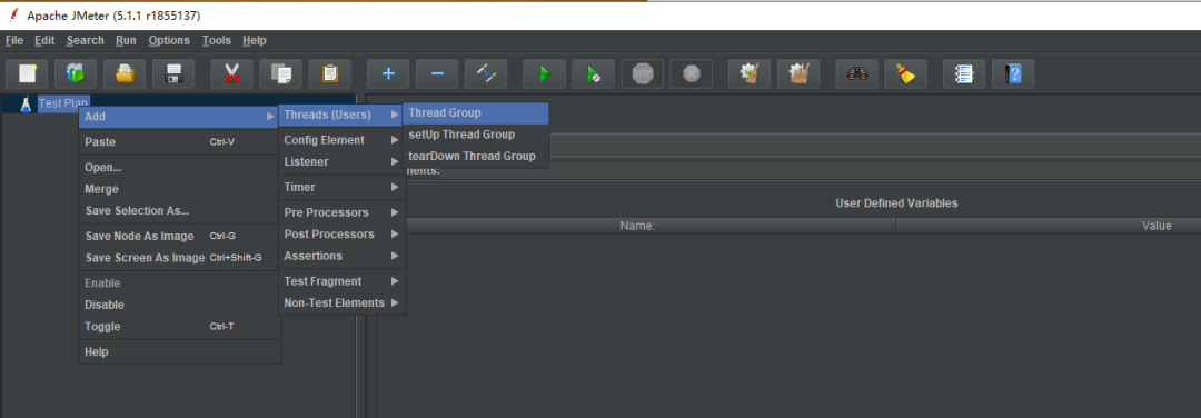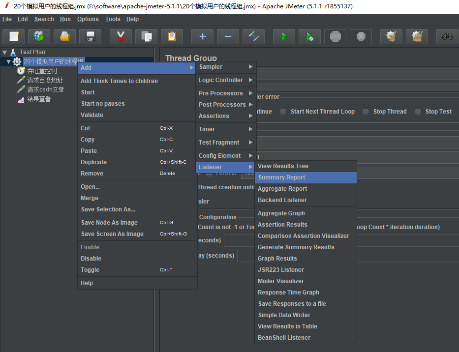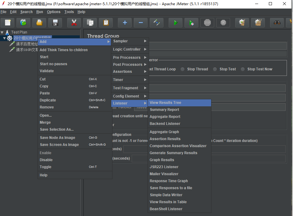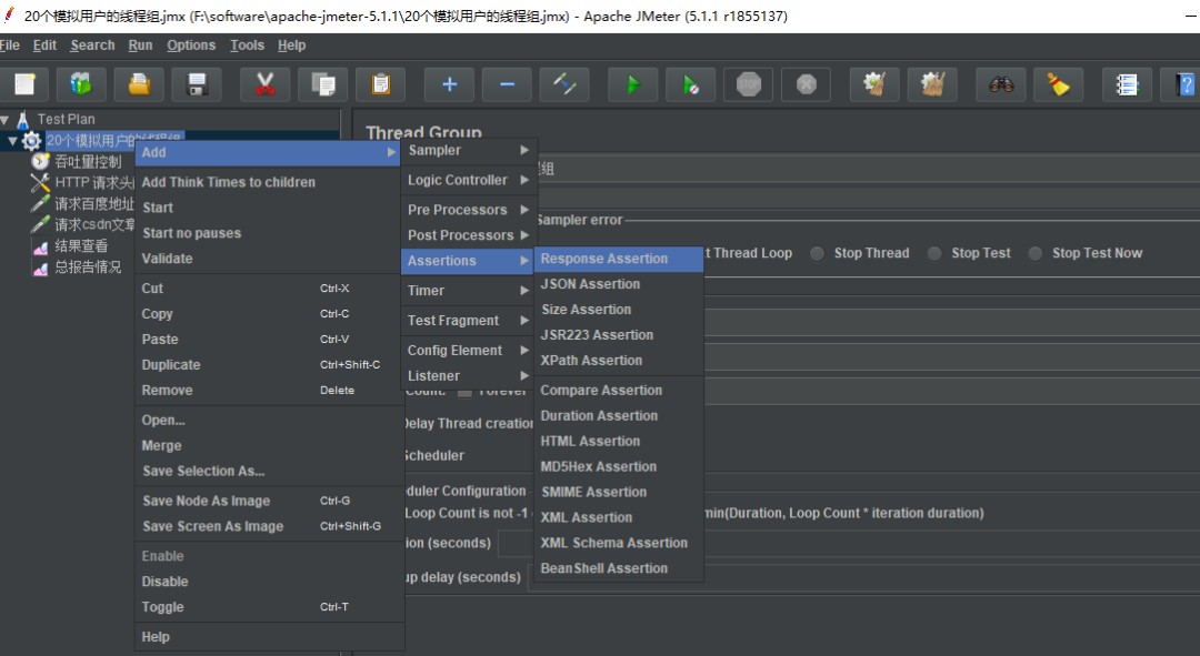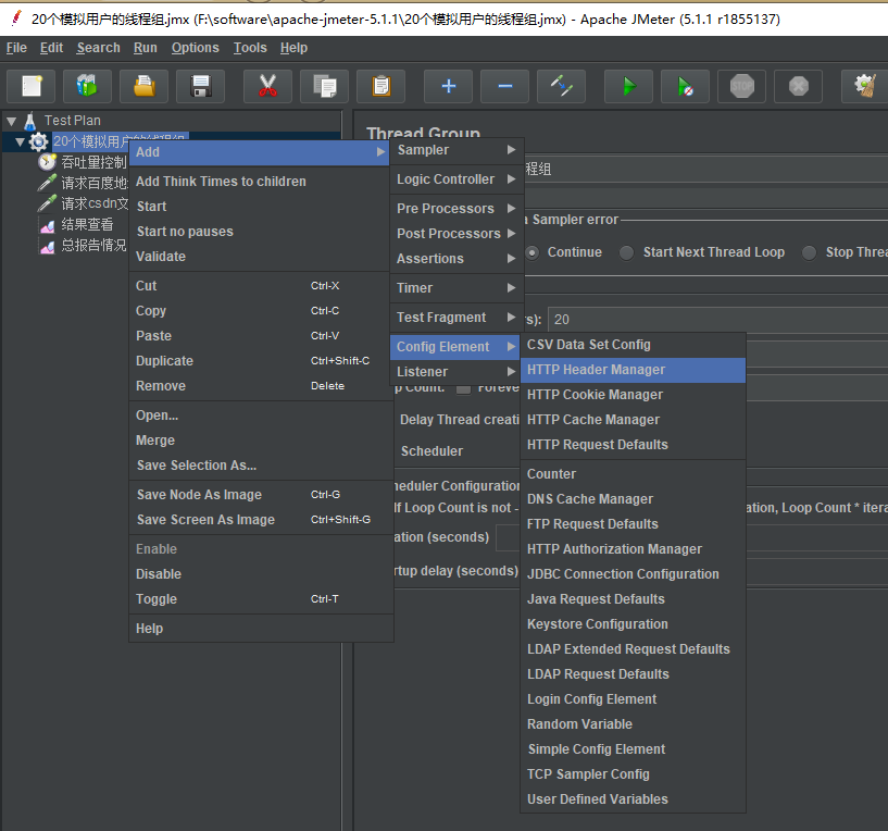 在测试计划中选择新建线程组,重命名线程组为20个模拟用户线程组。