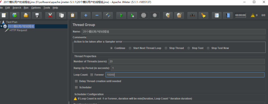 在 Number of Threads 栏 填写 20 ,设置 线程数为 20。在 Loop Count 栏填写 10000,设置 循环请求10000 次。