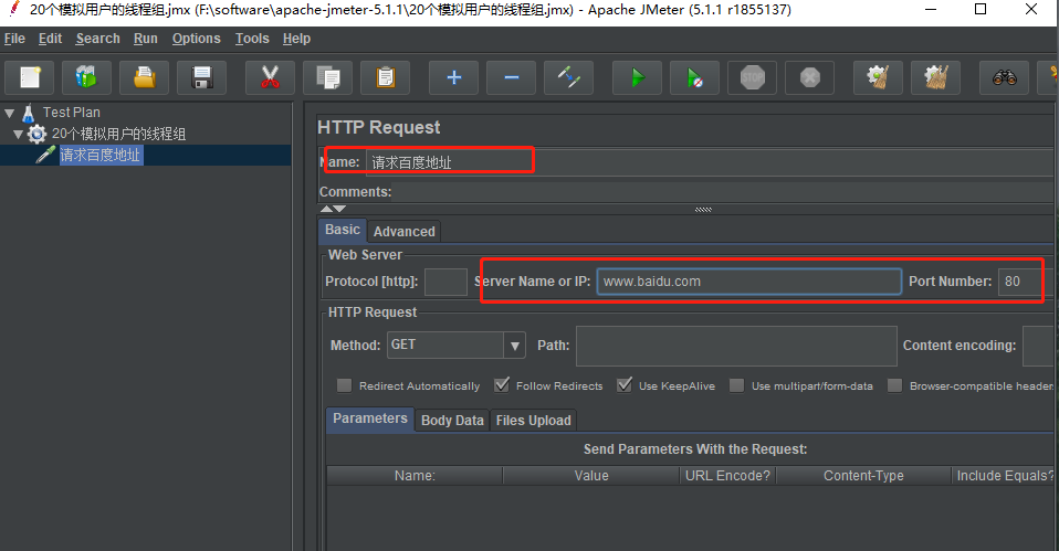 重命名该取样器为请求百度地址,在Server Name or IP