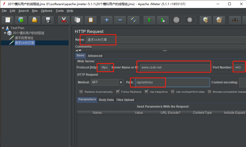 再在线程组上填写 HTTP 请求取样器,并按照如下图来进行设置和重命名为