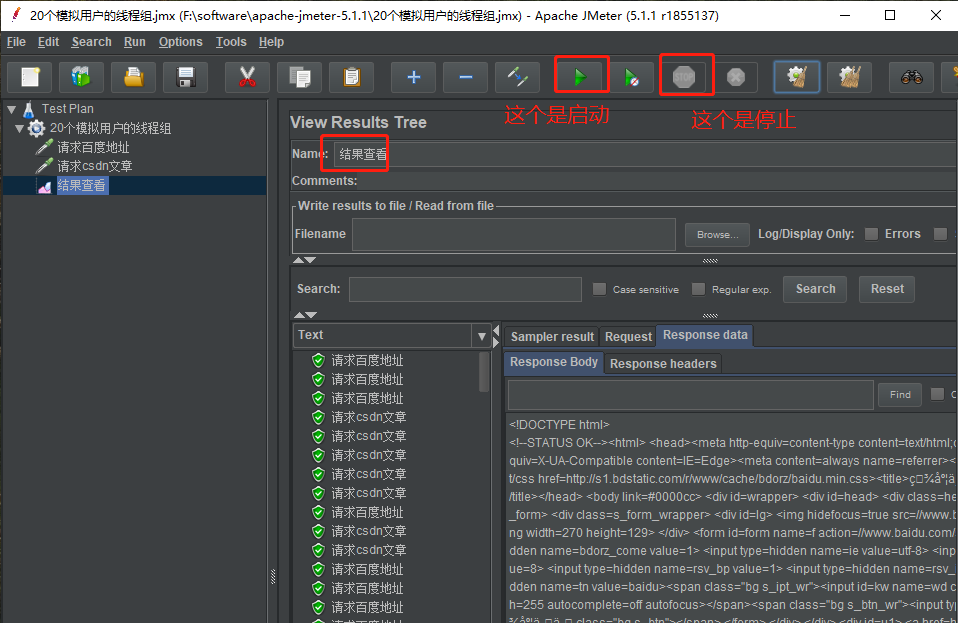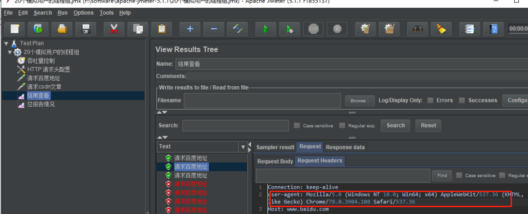 模拟20个 谷歌浏览器类型 用户 同时 访问 http://www.baidu.com/ 和 https://www.csdn.net/api/articles (该链接是获取 csdn 上的文章,如果正确会返回状态 "status": "true",) 在负载达到30 QPS 时的平均响应时间 和 结果准确度。