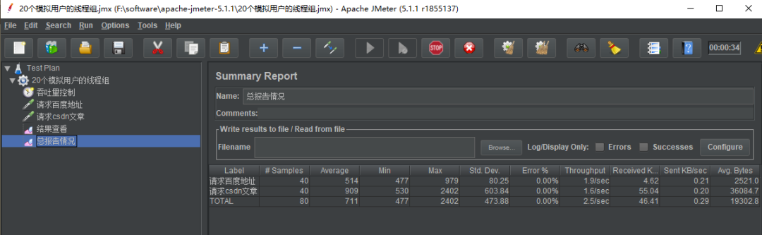 我们完成以上配置之后,点击运行,等待结果运行稳定好,查看 总报告情况 可以得到以下 截图