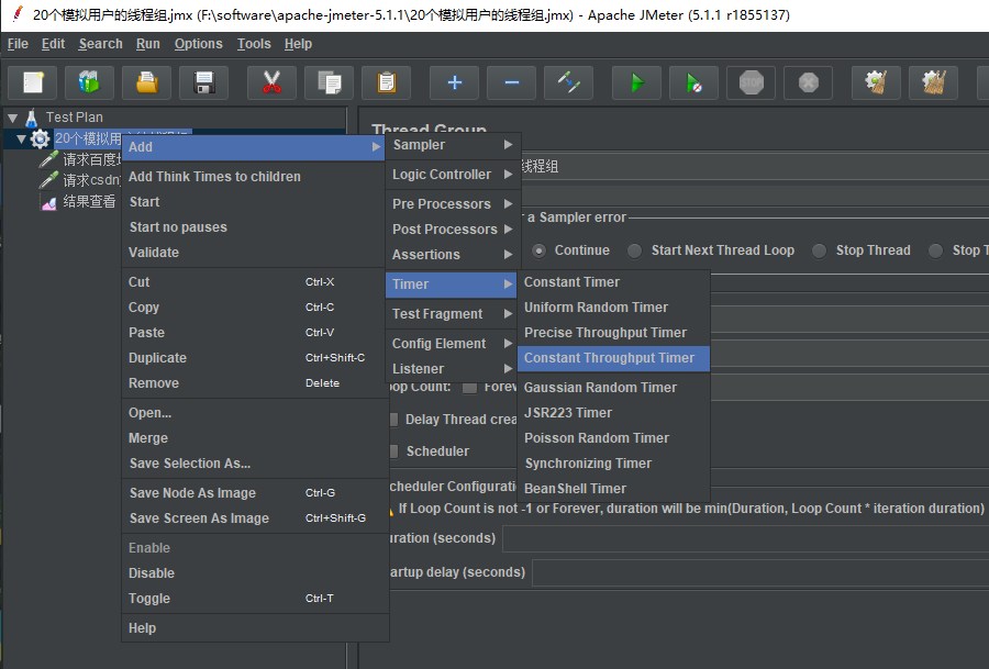 在线程组上右键新建吞吐量定时器