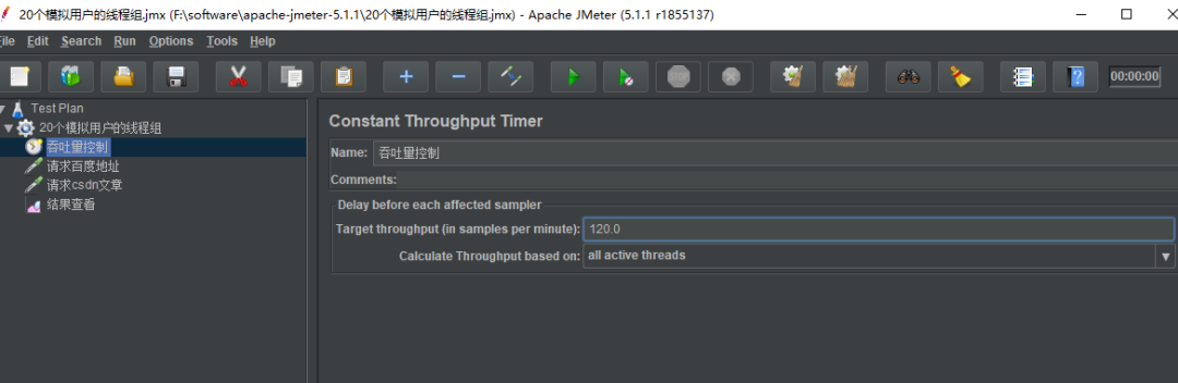 在 Target throughput( in smples per minute )(每分钟的目标吞吐量): 实际填写的数值为:60 * QPS ,所以这里我们填写1200,然后 Calculate Through based on 选择 All active threads 。