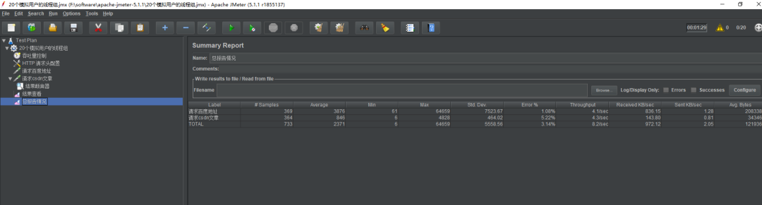 可以看到,在QPS 约为 5 的情况下,两个请求的总体的情况平均响应时间为 2.371 秒,当前总共发送了 733个请求,错误率 为 3.14%(暂定的时候,后面几个请求会断开,也算入了错误率的)。由于这两个请求的响应时间都比较慢和定义的用户数只为20个,所以QPS 比较难达到20 . 读者后面可以自己提高 线程数 或者替换请求地址来测试看看。
