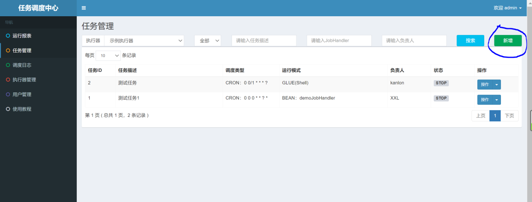 访问,http://127.0.0.1:8080/xxl-job-admin ,输入 admin/123456 。登录上面我们搭建成功的xxl-job的分布式调度系统。然后进入"任务管理" 页面,进行新建任务,