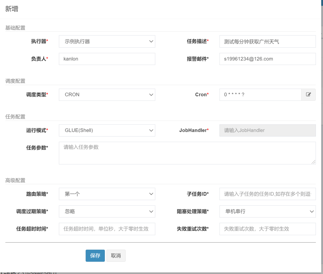经过上面的步骤,我们就有一个简单的调度中心系统了。基于这个调度系统,我们可以随便创建调度任务。这里我示范一个创建一个每分钟定时请求 http://t.weather.itboy.net/api/weather/city/101280101 链接获取广州天气的任务。参考:免费天气API,天气JSON API,不限次数获取十五天的天气预报 https://www.sojson.com/blog/305.html