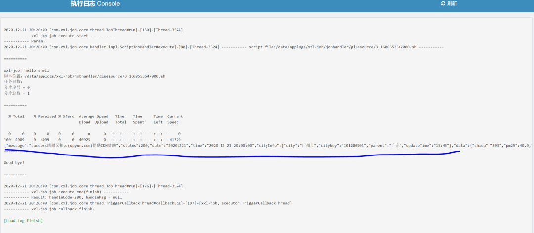 点击保存,然后返回任务列表,启动该任务。然后就可以到"调度日志"页面,查看该任务的执行记录了,点击具体运行的某个实例的“查看日志”能看到该实例执行记录的详细日志信息。