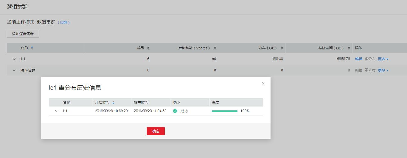 - 在弹出的对话框中单击“确认”,等待数据重分布成功。单击“确定”。