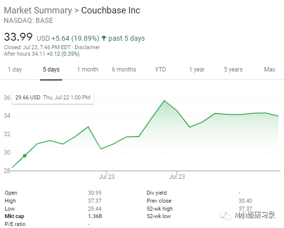 前段时间开源和infra人被Confluent IPO 还有一系列的mega rounds搞得很鸡冻(没错Confluent的分析我拖到现在也没写完),然而最近一个同样开源的NoSQL database,Couchbase, IPO定价才刚过$1Bn.(对比一下,竞争对手MongoDB 市值超过230亿美金!)上市第一日(居然)上涨26%,但是在database这样风口正盛的大市场,仍然是不到15x PS的估值——要知道,现在美国二级市场SaaS公司虽然估值回调不少,但是对增长率>30%的高增长公司PS也将近30x。这样的现状,不知道会不会让大家对待开源和infra稍微冷静一些。IPO虽小,M小姐倒是觉得,是一个很好的契机,把Couchbase和更成功的竞争对手MongoDB做个对比,借此唠唠,什么是好的基础软件,什么是好的开源。Couchbase做的事情也很好理解,就是MongoDB的直接竞争对手,也是一个开源的NoSQL数据库(这个开源有点勉强,后面会说到),与MongoDB一样是document oriented database。基本面:最火的赛道,最中庸的metrics