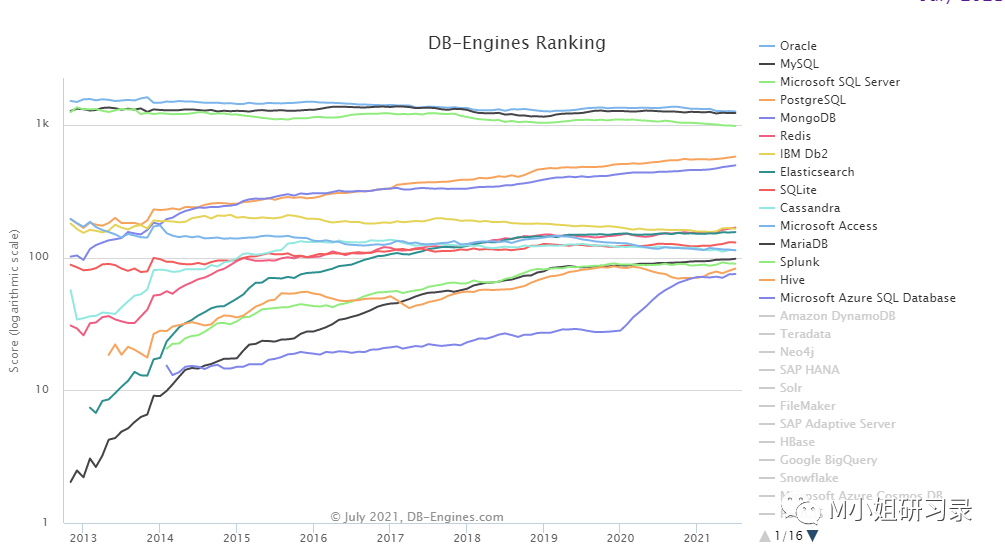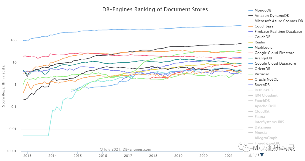 而且,刚开始的时候,很多人觉得NoSQL database还不适用于Mission critical的应用,现在,据称80%的Couchbase客户已经将他们的数据库用于部分或大部分业务的source of truth or system of record了。然而!为什么couchbase的体量会比MongoDB小了这么多呢?这对于更多涌入的玩家,有什么启示?当然,数据库这个池子是足够大(至少也是500亿美金,10+%增长率),AWS也是在宣扬Purpose built database, 所以百花齐放是必然。但是我们从权威的DB engines其实可以看到这个市场的几个特点:首先,集中度相当高,头部效应明显。从下图DB engines的ranking不难看出,前5-6名跟其他玩家的差距相当大。没有挤进前5名,或者增速不够快,天花板都是不高的。这个其实也不难理解,一方面,数据库是需要不断跟场景打磨的底层产品。越是头部,越是有更多的用户一起来不断提升产品的性能和适配场景。另一方面,底层产品的粘性足够高。都是至少120+%(对比一下,MongoDB 超过120%,Snowflake更是令人发指的145+%!)。所以couchbase 115%的NDR在一般SaaS中也许不错,这个品类中只能算中流。此外,上图也可以看出,过去几年的数据库领域真是迎来数十年一遇的大变局。云计算+数据两大驱动力,无须赘述。很多2011年之后的数据库都得到了蓬勃发展,百舸争流,很多老牌玩家都在被超越。