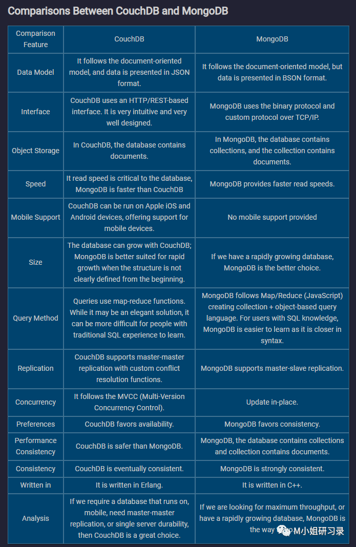 有时候一些创业者说,我做了一个超级快的数据库,一定会有人用。要知道,真正能在纯性能上绝对高于所有竞争对手10x的革命性技术坦率来说是极少的。大家都知道benchmark就跟人工智能领域刷榜一样,总能找到最favor自己的场景或者做针对性的优化。Database虽然是底层产品,也是跟应用场景以及使用者/开发者的习惯息息相关。任何产品的优化都不免要面临一些tradeoff, 对这些tradeoff的选择,本质就是对场景和用户的理解。比如最经典的数据库设计中要考虑的CAP (Consistency, Availability, Partition tolerance)问题。noSQL数据库200多个,MongoDB作为后来居上者,现在在DB-engines 整体排名中高居第五,甚至碾压AWS,GCP等大厂。Couchbase在整体排名中仅为29名(要知道,底层软件相对来说头部比较集中,20名之外基本已经是边缘产品了,这也解释了为什么成立十年的couchbase收入仅有$100M出头)。即使在细分的document stores里,排名第4的couchbase 也明显被各种后来者超越。Couchbase和之后合并进来的Membase都脱胎于Apache CouchDB,release的时间和MongoDB并无很大差异。在一开始,其实二者的绝对performance并没有这么大的差别。但是下面这个对比,可以看出一些设计思路上的差异。但是MongoDB有几个设计,跟couchbase比起来未必是apple to apple的优劣,但是更符合用户的需要。比如在CAP中,MongoDB明显的倾向CP,虽然牺牲了一些Availability,但是Scale更快。在当时(2010-2015年之间)数据量开始大规模增加,要开始考虑接受还比较新的NoSQL数据库的公司,遇到的痛点首先就是应对快速增长时,兼顾规模和效率。相比之下,Couchbase在replication 和mobile上的优势,在当时的环境下似乎有些鸡肋。而且,虽然read, write都很快当然最好,但是对于分布式数据库的需求主要是业务,也就是数据使用侧的推动,MongoDB优先read性能,而不是试图做到两手都抓,反而适应当时的业务环境。此外,MongoDB的Query更接近于大家熟悉的SQL,C++比Erlang更通用。这种一定程度上的熟悉性,非常符合一个新的、基于社区传播的产品易于上手的需要。让大家接受起来更容易。除了技术之外,marketing也是不可忽视的一环。经过一系列重组的Couchbase (CouchOne, Membase两家公司来源于Apache CouchDB,合并为Couchbase…), branding越来越confusing. NoSQL彼时还算是新兴行业,本来就需要集中火力做市场教育,公司本身产生了很多不consistent的对外messaging,这真是早期发展的硬伤。话说回来,能在产品和技术上做出这样的取舍,一部分原因来自于创始人的基因和出发点吧。