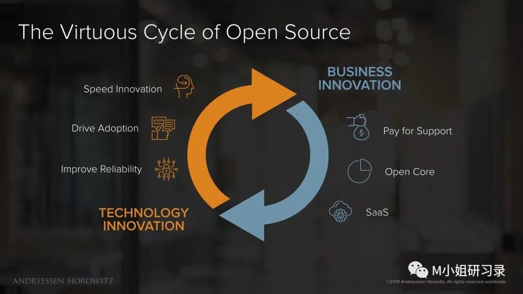 所以投资人这么关注why this, why you,还是很有理由的哈。Couchbase虽然诞生于Apache社区的CouchDB,但是经历了重命名成CouchOne,又跟Membase合并等种种事件后,开源社区已经基本上荒废。S-1中的Go-to-market也完全没有提开源社区。所以可以认为,couchbase基本依赖传统自上而下的sales 。然而MongoDB一开始就极其重视开源,借助社区力量形成了NoSQL RDMS的行业标准。这个活跃的社区不仅为MongoDB早期的商业版带来了高质低价(当然marketing也不便宜)的leads, 也成为日后Atlas (managed service)的基础。这两种做法从数字上看也是非常明显。2020年的Sales & Marketing占收入比重,Couchbase高达70%,而MongoDB仅为50%左右。而2017年MongoDB上市的时候,这个数字也高达70+%,不到5年的变化相当显著。当然,这个数字也不是可以做单一评判的指标。Snowflake去年上市的时候,这个数字甚至超过100%。但是当时公司ARR $500+M和收入增速高达120+%!所以按照现在美国二级市场对SaaS公司高成长性的偏好,这种利润换增长的方式,仍然被市场接受。相比之下,不到30% YoY growth的couchbase 就非常不讨好。从资本效率的角度来看,两家创立时间差不多的公司,IPO之前,Couchbase总融资$251M, MongoDB $311M,但是2020年收入来看,后者是前者的5倍还多。资本效率的差距不可谓不大。很多人要么认为开源就是技术圈的理想主义,要么只是当做一个go-to-market的手段。M小姐看来,这都未免以偏概全,甚至有可能极大误导一个企业的开源战略。在a16z那篇著名的开源实操文章,Open Source: From Community to Commercialization 中,这个模型其实总结得非常清晰。这个flywheel右侧几种商业化模式,包括上一代的Redhat式的服务、大多数开源公司采用的open core, 和实现第二曲线增长的SaaS模式,都只是开源价值变现的结果。M小姐以为,开源核心的价值创造,来自于speed innovation. 因为有了(经过选择的)最优质客户的共同打磨,在各个真实场景的迅速测试,优秀人才的经验共享和共建,才能打造出有技术竞争力的产品,才能成就商业价值。上周的PingCAP Devcon, CEO刘奇有一句话说的也是这个意思:而对于一个诞生于startup的infra产品而言,让自己的产品迅速在各个场景中经历打磨洗礼、升级换代的最有效的方式,就是开源。这也是开源最大的价值(如果不是之一)。所以,衡量一个优质的开源项目/公司,核心是看这整个链路是否打通。没有社区共建的商业化,和没有真实场景的技术创新,都是片面的开源。Cloud 是大势所趋,虽然MongoDB和Couchbase,或者说绝大多数的开源infra公司,都是从卖企业版的open core模式起家,但是MongoDB借助SaaS业务实现第二曲线腾飞的自我革新,绝对是商业史上值得称道的经典。MongoDB 2007年成立的时候,云计算还不知道在哪里。一开始的近十年时间,都是经典的Open core路线,给大客户卖商业版MongoDB Enterprise,公司自己manage 底层基础设施。