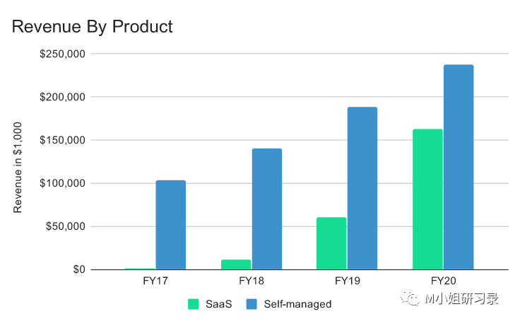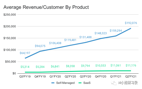 2017年上市的时候,这部分收入还不到当时MongoDB $100+M总收入的1%(没错啊,2017年MongoDB的收入就跟Couchbase现在的收入差不多了额)。而Couchbase直到2020年(!)才推出Couchbase Cloud,相差了5年之久!要知道,现在MongoDB Atlas ARR都达到总收入近一半,超过$200M了,增速还高达40%,俨然成为了第二大业务支柱!成长速度绝对惊人。这种SaaS服务现在听起来很顺理成章,但是对于当时已经围绕Open-core打造了一整套营销、sales和产品体系的MongoDB,SaaS这个关键的第二曲线对整个组织可谓是不小的挑战,也是对掌舵人战略眼光的考验。这个难度可以说对于需要同时攻克enterprise大客户和SMB的SaaS公司来说,是共同的挑战,可以单独一个专题来说了,今天暂且不表。就说一个简单的点,看看下图两种产品的平均合同额,SaaS产品还不到企业版本的十分之一,就知道SaaS和Opencore模式面对的是完全不同的两个客户群体。但是稍微熟悉B2B sales的同学都知道,卖传统的软件跟organic 驱动的SaaS产品,光是对销售的激励方式都非常不一样,同时manage两种营销组织体系的坑真的不要太多。M小姐想说的就是,这种企业业务、组织和文化层面的全面升级,值得让我们对MongoDB的管理层刮目相看。(这个要感谢的,就应该是2014年上任的CEO)相比之下,Couchbase有两个现在看来可以说是弯路的决定。一是花了很多精力做mobile平台的support, 后来被证明是一个比想象慢的多的市场。这个2014年launch以来就一直不温不火的需求仿佛是将公司拖入了尾大不掉的泥潭。Mobile的收入甚至都没有在S-1中单独披露,可以想象即使在今年也乏善可陈。中间这么多年增长乏力,不知是不是机会成本的原因,似乎并没有什么转变的意识。更致命的,就是在云计算的时代到来的时候,公司没有及时转向SaaS模式。在SaaS模式已经成为几乎所有商业开源软件的标配的时候,Couchbase的SaaS收入也还几乎可以忽略。看到这个巨大的差距,可以让大家从另一个角度理解,创业者所需具备的战略能力是怎样的。能支持各种mobile devices, edge computing 场景的NoSQL database, 不能不说是一个技术有亮点的功能。但是在市场印证上,在行业关键拐点的识别上,一两个大的判断,真的有可能带来公司天壤之别的发展。为什么创始人要建立好组织,让组织和高管团队帮助自己脱离日常的运营细节,才能在必要的时候,跳脱出来,仰望星空,做重大的决定。Bezos就说,他一年只需要做2-3个决定,但是 Be right, a lot.