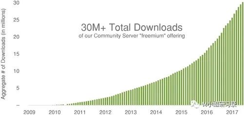 几大云厂商自不必说,渠道优势杠杠的,老牌的Casandra, IBM Cloudant, PostgreSQL, RavenDB, 等等,也都在这个大变局中地位开始摇摆。这个摇摆,就让大量的新势力得到了发展的空间。第三,开源在这个变局中是一股关键的力量。2021年是Open source license 数据库全面超越commercial license数据库的关键一年。有了云计算的推动,有了数据爆发驱动的场景和痛点,这个传统无比sticky的市场开始有契机来接纳还没那么完美,但是可以解决一两个关键问题的新的基础设施(比如当年被大家一边骂一边用的MongoDB,历史多么熟悉)。正如前面所言,开源的意义是什么?这里又多了一点,就是跑马圈地,占领场景和心智的高地。看看MongoDB 2017年S-1,项目开始到5M download,花了超过5年的时间。而上市的时候,虽然跟现在的Couchbase类似,年收入在$100M 上下,但是累计下载量已经超过3000万!这就意味着,这些社区里的公司,基本已经不大可能使用别的直接竞品(除非10x better?!)。而这些公司的价值,从产品的角度而言,正如前文所提到的flywheel,他们所贡献的场景和contributor,让一个startup得以迅速测试这么多环境,是融资再多也很难买到的。从商业角度而言,不论是作为大企业客户的lead generation, 还是直接成为对于中小客户的freemium 模式,更是不可估量。这就是为什么在MongoDB Atlas launch不到两年的时间里,2018年客户数量就超过了3000!