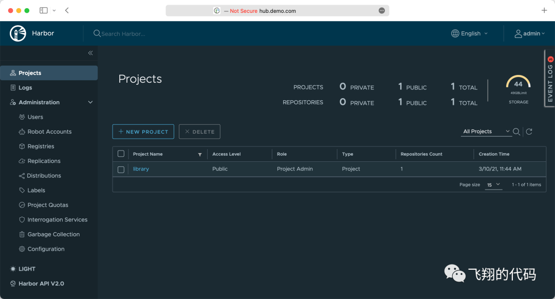 ,密码是在harbor.yml中配置的,登录后界面如下: