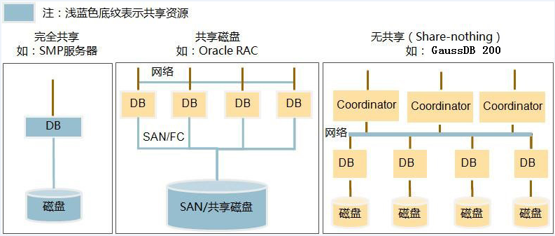 Share-nothing又称为无共享架构,和其他架构的对比请参见图1。