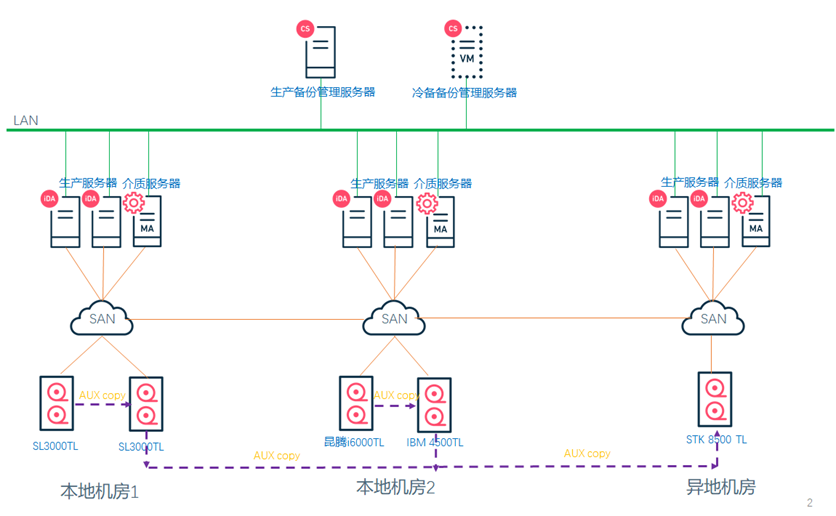 旧的架构是生产数据通过CV备份软件,使用MediaAgent(介质服务器包括lanfree和lan两种模式)传输到本地机房1的SL3000物理带库,再将所有数据定期拷贝到本地机房1的另一个SL3000物理带库,确保两份可用数据,本地机房2也是相同架构,保证有两份可用数据。再将需要保留的数据拷贝到异地机房的STK 8500物理带库,形成异地数据保留。