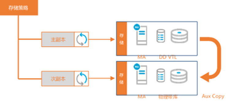 在CommServe配置存储策略,配置数据路径到DD虚拟带库,主拷贝为备份数据目的地,配置数据路径到DD VTL带库,选择性辅助拷贝通过计划自动将所需要的数据复制到物理带库,实现数据的永久保留。