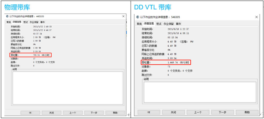 很明显,现在的备份效率,较之前得到很大的改善,平均吞吐从之前的785.51GB/小时,提高到1449.74GB/小时,优势显而易见,备份效率提高了一倍。