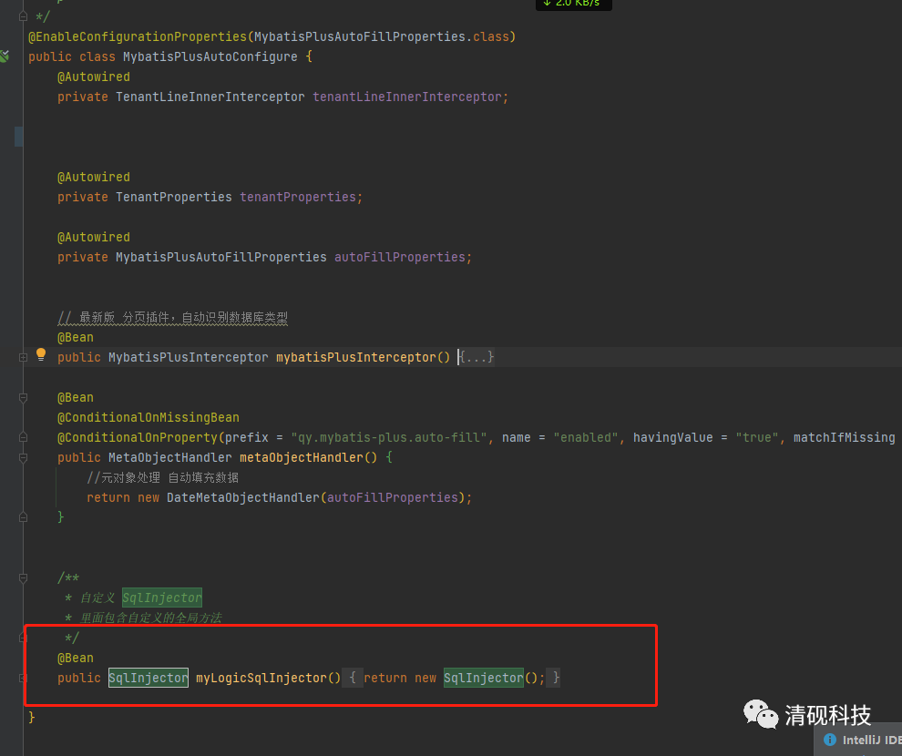 这边需要注意一点要将SqlInjector类交给spring管理,不然自定义方法不会生效(因为我将这些代码放在自定义start里面,所以这样配置)