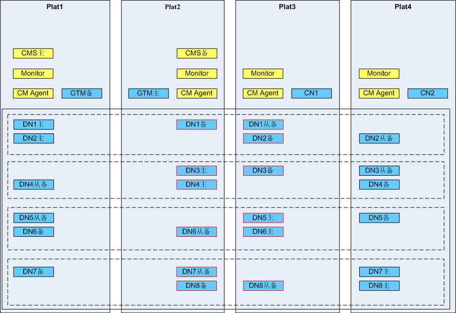 - 对于每组实例,其主、备部署在不同的节点上。例如:GTM的主、备分别部署在不同的节点上。DN的主、备、从备部署在不同的节点上。
