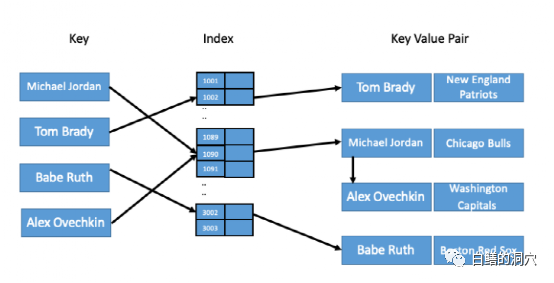 Hash索引:PostgreSQL上的一种特殊的索引,针对键值使用一个HASH函数,因此HASH索引只支持等于操作,不支持范围扫描,而且目前HASH索引也不支持复合索引。在Hash索引中,将键值转换为一个HASH值,然后再进行定位,HASH索引不需要枝节点,因此索引的大小会比普通的B-TREE索引要小。其逻辑结构图如下。