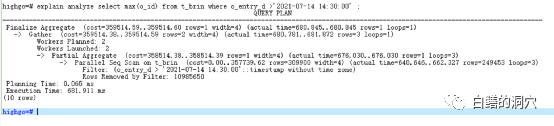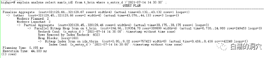 我们惊喜的发现,执行计划使用了idx_tbrin这个索引,执行时间从681.911ms缩短到44.183ms。如果我们使用普通的B-TREE索引会怎样呢,我们删除这个索引然后再创建新的索引,从创建索引的速度上我们就看出BRIN索引创建的时间比B-TREE索引要快得多,因为BRIN索引的大小要小很多。