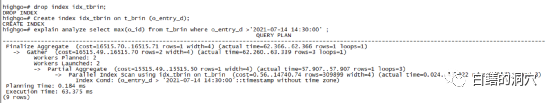最后我们从SQL的执行时间上,使用B-TREE索引,执行时间为63毫秒多,B-TREE索引比BRIN索引要高出20毫秒左右。