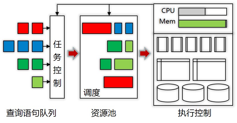 - 调度:查询语句在解析优化后由优化器评估所需要的资源,资源条件满足则进入执行控制,如果不满足则进入资源池等待。