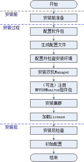 本文档以使用《配置规划工具》生成安装模板进行自动化安装的场景作为主线进行介绍,单AZ高可靠集群安装流程图如图1所示,单AZ高可靠、支持透明加密集群安装流程图如图2所示。推荐用户采用《配置规划工具》安装方式。