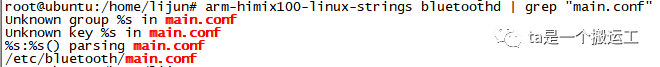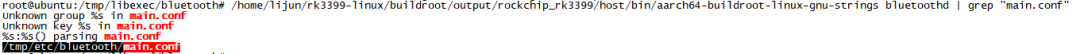 在编译blueZ时可以通过--sysconfdir=DIR参数指定下文中的main.conf存放的路径,如果没有指定则放在默认路径PREFIX/etc下。有可能把main.conf放到指定的路径之后设备的名字还是默认名字“BlueZ 5.18”,这应该是放置的路径不对引起的,通过strings命令查看bluetoothd中的main.conf字串,再把main.conf放到该字串中可以解决该问题。比如下面这张图,要把main.conf放到/tmp/etc/bluetooth,