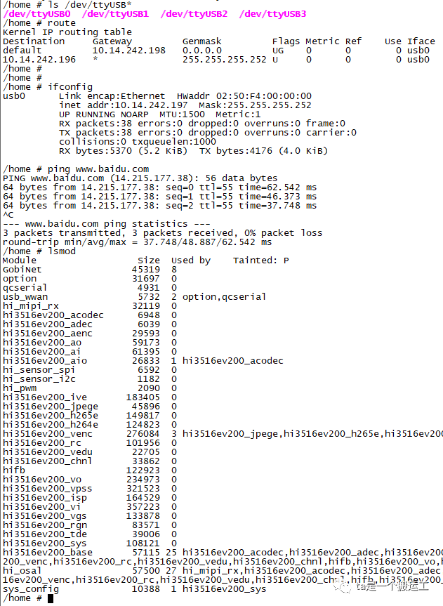 烧入内核,将生成的ko文件拷贝至板端,启动板端之后不会自动创建/dev/ttyUSB*设备文件,依次加载usb_wwan.ko、qcserial.ko、option.ko(后面两个ko依赖前面一个ko)、GobiNet.ko会自动创建/dev/ttyUSB*设备文件,如下所示,