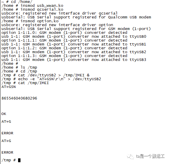 cat /dev/ttyUSB2 > /tmp/IMEI &,echo -e "AT+GSN\r\n" > /dev/ttyUSB2,如下图所示,