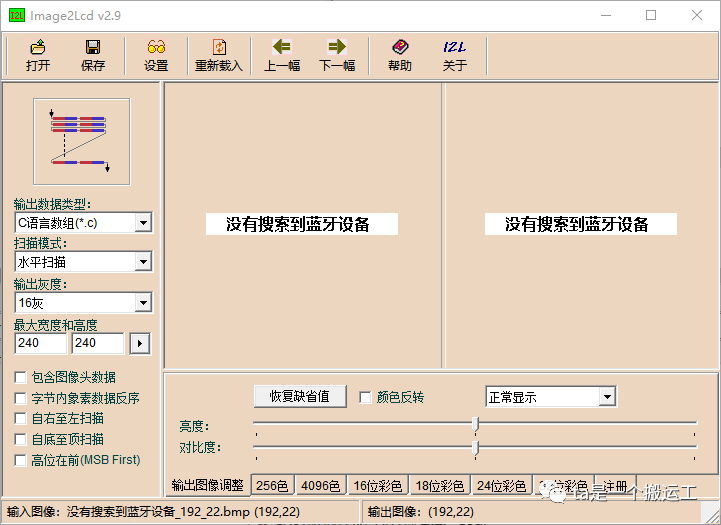 该方式可以显示任意字符。缺点是必须提前知道要显示的内容。以本产品为例,在windows画图工具输入汉字或英文字符,保存为单色bmp(占用空间小,没有灰阶)或者16色bmp(占用空间大,有灰阶,支持多个灰度),再通过image2lcd将图片转换为数组,其他的操作跟点阵数据一样处理。