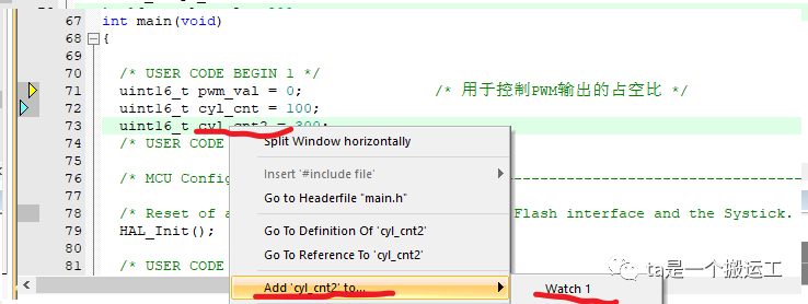 如图,main函数中有局部变量cyl_cnt2,通过右键选择该变量的方式添加该变量到Watch1,即可实时查看该变量。