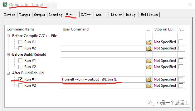 keil提供了生成hex文件的勾选项(在Options for Target->Output中),但没有提供生成bin文件的勾选项,需要用户添加预定义命令生成,在预定义命令栏中输入“fromelf --bin --output=@L.bin !L”即可。如下图所示,
